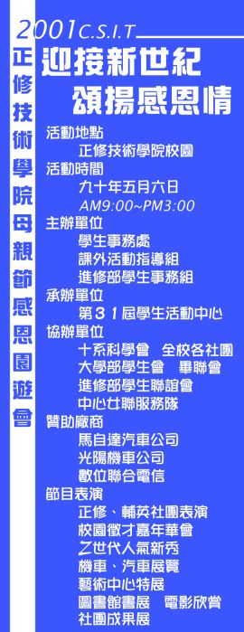 到了三年級的時候,當上了學生活動中心的幹部,有幸參與各種大型活動的舉辦,下學期的活動還都是三年級幹部接的,那時候有自願擔任母親節園遊會的總召;當時也不知道為什麼會有這種膽子去接這活動,我一向都不是很想去承擔一些重大事情的責任;為了這活動,簡直就操翻我了,從場地協商、廠商、器材、設備、廣告、園遊券、宣傳、企劃、節目、交管、印刷...通通要去策劃,光是打廣告贊助企劃書、活動企劃書就不知道被退了n遍,每天熬夜趕企劃書還比趕靜力學作業還認真= =...加上沒幾個人會電腦美術,所以要用自己三腳貓的PhotoImpact來設計園遊券、關東旗、海報、帆布...想當然爾,設計出來的實在是不怎樣@@...更慘的是PhotoImpact只適合作小網頁的圖片,根本不適合使用CMYK四色印刷和需要大解析圖檔的彩色印刷,最後園遊券還差點趕不出來,連切裁縫線都來不及"(其實這都不是最慘的,最慘的是收來的園遊券費用...三十幾萬的現金少了兩萬多...當時真的有眼淚快掉下來的感覺...還寫了悔過書,可是錢不是我幹的XD)