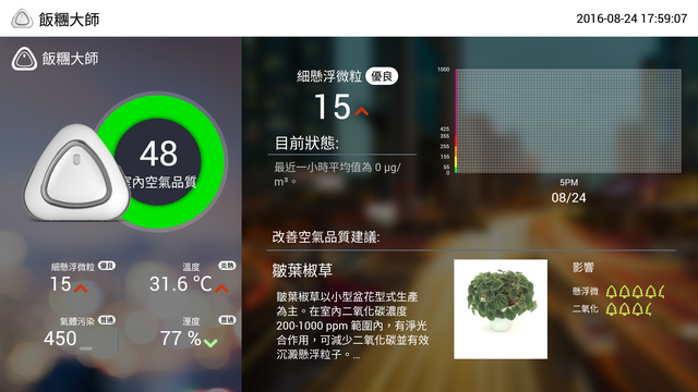 在各項數據部分橫式狀態還會顯示【改善空氣品質建議】並且顯示歷史資料,感覺很適合開店的人用平板或是電視輪播店內空氣品質。