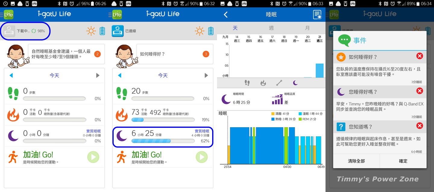由於Q66在睡眠模式才會記錄睡眠資訊,但是睡眠模式會關閉通訊,所以每天早上時間到恢復為日常模式後,進入APP才會開始擷取手環的睡眠記錄。下載至手機後就會開始進行分析,然後顯示你的睡眠品質。有趣的是還會提供你一些建議在事件欄內。如下圖: