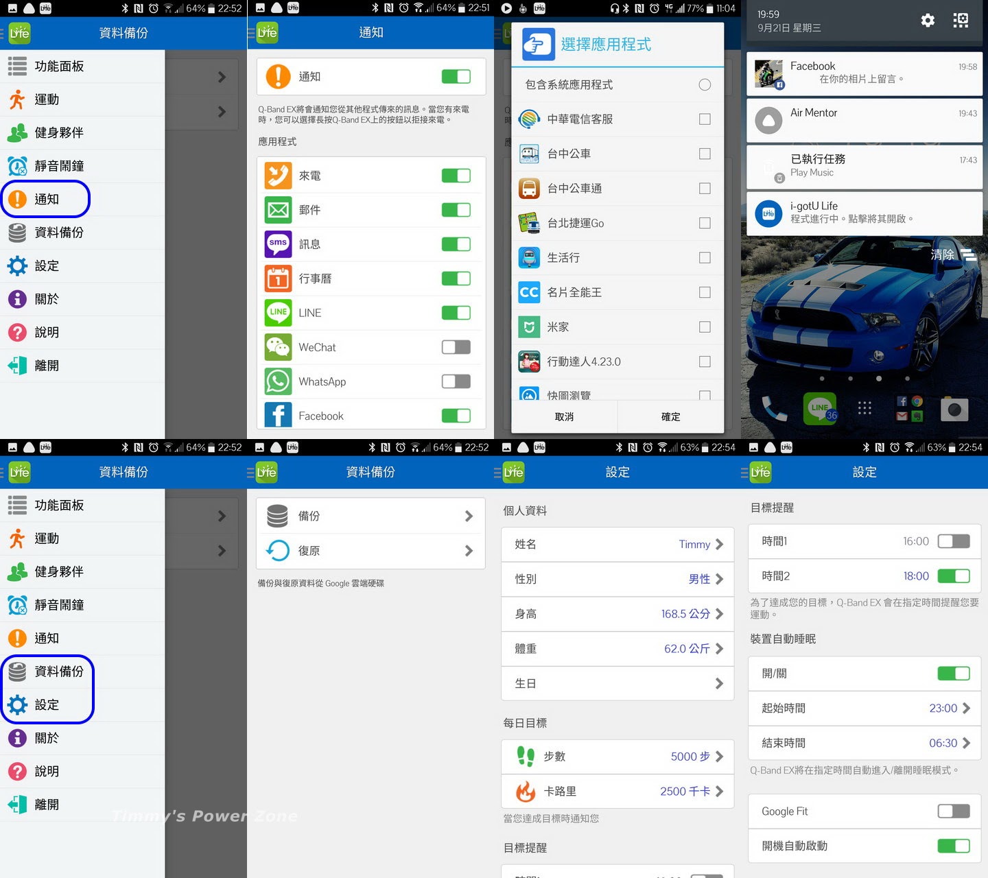 - 通知:就是通知提醒,當有APP推播、訊息、郵件、Line...諸如此類的,只要是會觸發Android系統的通知事件,都可以在這裡設定想要提示的項目。常見的APP都在清單上,若沒有列出的也可以在【自訂應用程式】中自行選擇你想要接收的應用程式。比較實用的像是國道路況、天氣、甚至Spotify等,都可以在手環上顯示通知及震動。這點是我最在乎的,戴手環目的就是希望像秘書一樣的一直提醒我有資訊進來~