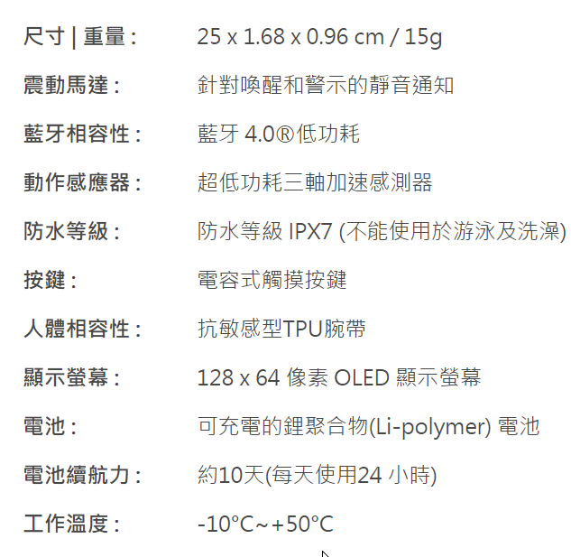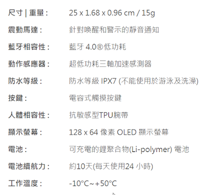 下表是官方提供的規格表,就數據上Q68HR與Q66相差不大,可以說幾乎都相同,僅有厚度(因為多了心率感應)與電力有所差異;不過操作與細節部份其實是有所差異的,這些在規格表上是看不出來的。