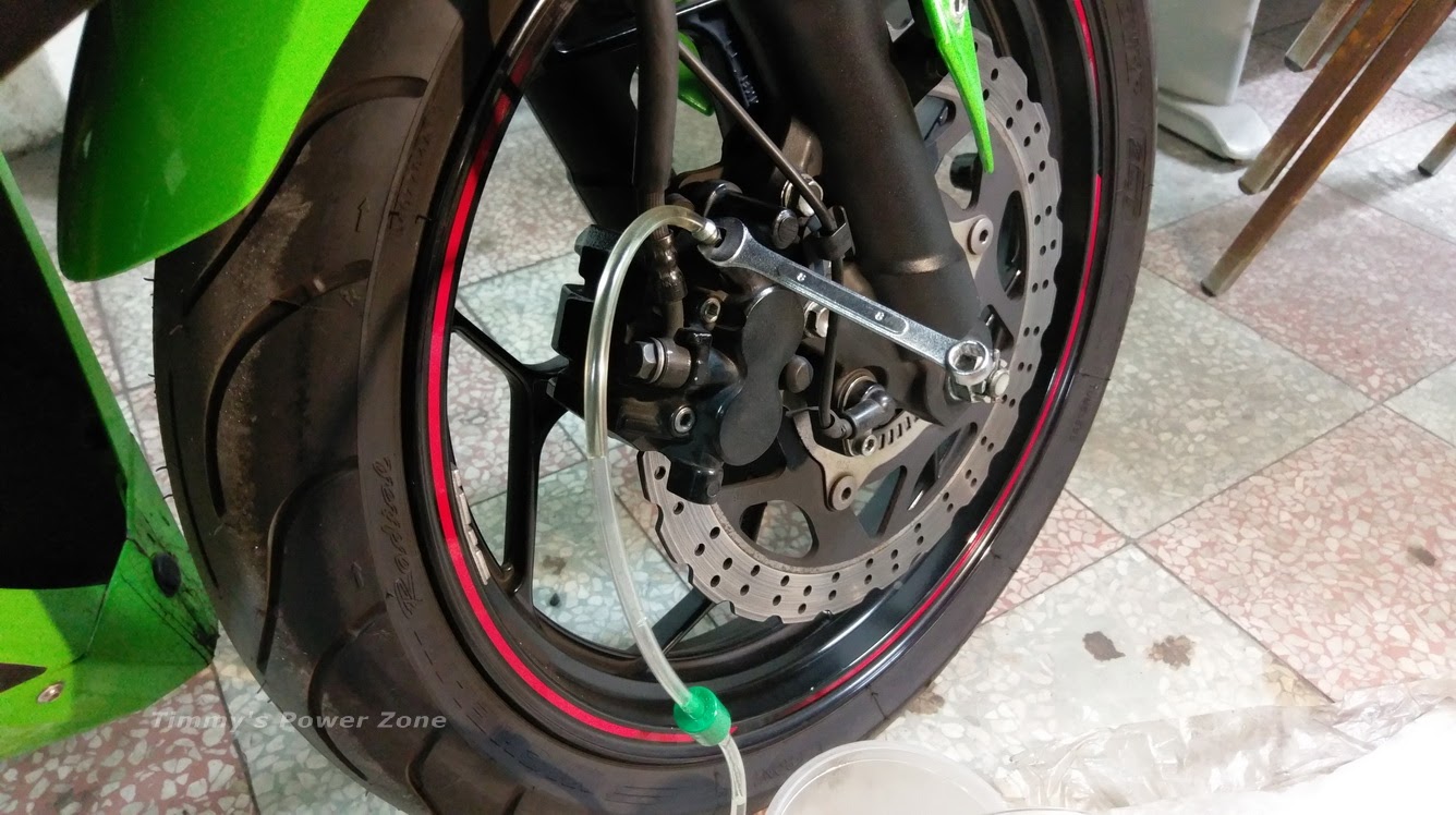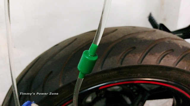 一樣邊推煞車拉桿,一邊補新的煞車油,大概按了3~5分鐘,油管內的油已經隱約看到是透明的新油了