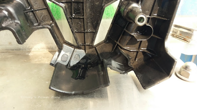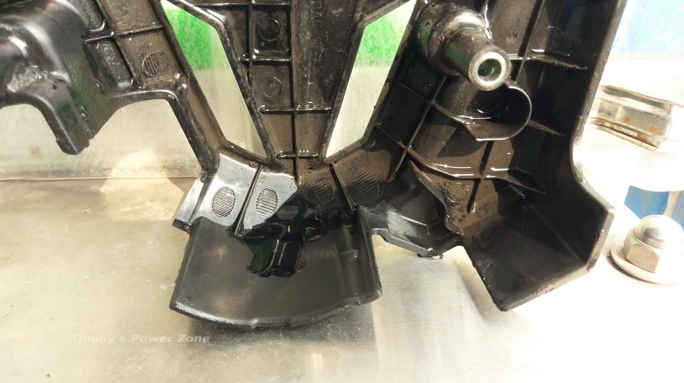前齒蓋部份洗的其實還蠻乾淨的,但是前提是要拿刷子頻繁的刷刷刷刷刷刷...邊刷邊噴,最後才有可能洗的乾淨,所以不是噴一噴、沖一沖就可以搞定。跟我常用的煤油比起來,還是煤油清潔比較夠力。但好處就是洗車的時候可以用水沖一沖就清洗掉油污。