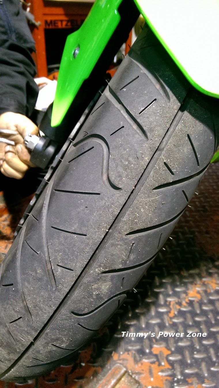 我將矛頭指向前輪,因為根據經驗總覺得是前輪造成的,於是去豐原大大輪車行找何老闆換掉前胎。雖然我的原廠前輪胎紋還很深,不過若不換掉我想是心不安的。