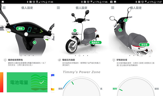 另外也提供很多客製設定,像是設定儀表顏色、車輛音效、電力回充、超速提醒...等等的