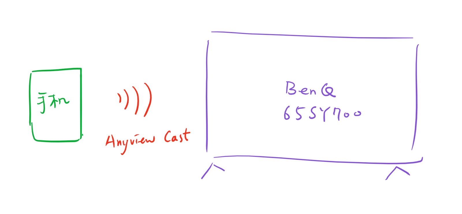 Miracast主要給支援的裝置(很遺憾的Apple手機不支援)做無線投影用,手機連接上後就會把當下的畫面直接投射在螢幕上並且可同步顯示。示意圖如下: