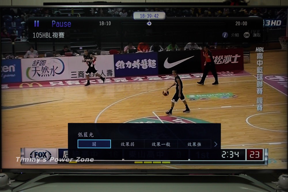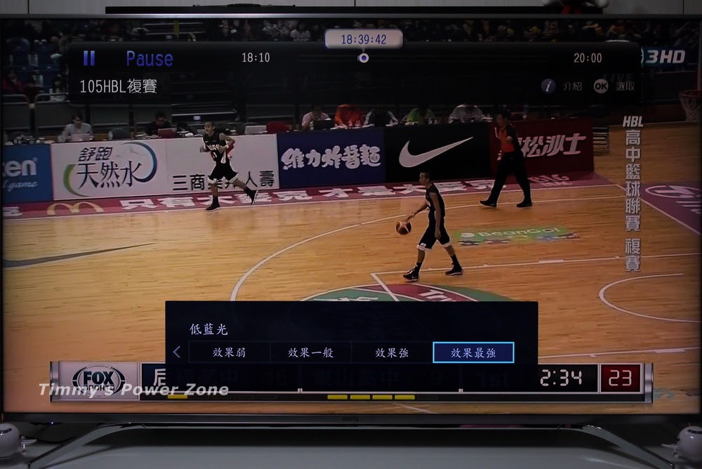 低藍光效果實測,未開啟前,電視畫面內的白色部份(如FOX的Logo底色)是比較正常的白色