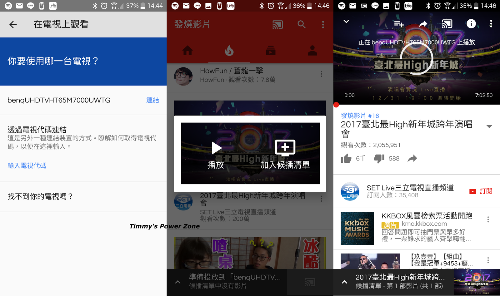 推送程序很簡單,在手機的YouTube選單點選『在電視上觀看』,找到要推送的65SY700後點選「連結」,就可以了。接下來就是選取影片再按『播放』,接著畫面就會推送到電視上了