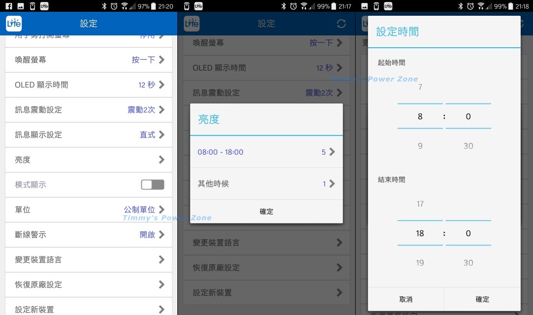 APP中有個功能可以讓手環節省一些電力,這應該也是QBand系列的特色之一;可以在「設定」中選擇「亮度」,選擇特定的時段要用多少「亮度」來呈現螢幕,這個時段也可以自己選擇,像我一天8小時工作都在室內,就很適合把上班時間亮度降低,節省一些電力。