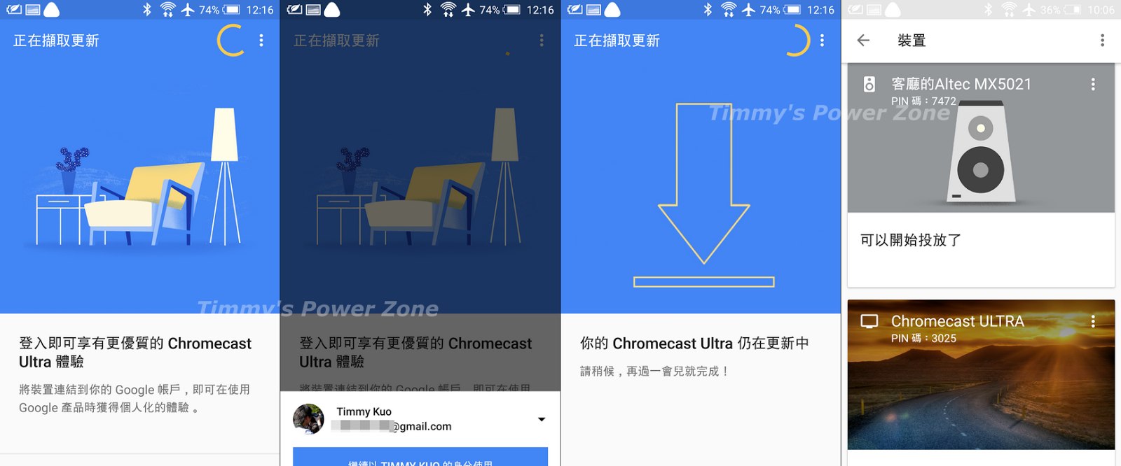 第一次使用,它會先上網擷取更新,同時會要求你登入Google帳號(其實我不太懂為合要登入帳號),更新需要花一段時間,大約5分鐘。結束後就可以在裝置內看到你的Chromecast ULTRA了!