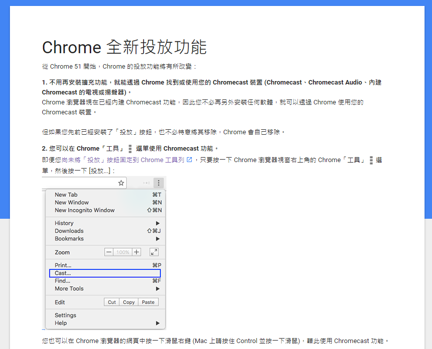 如果你電腦有Chrome瀏覽器,現在也可以輕鬆對Chromecast裝置進行投放與設定,使用前要稍微了解一下它的使用方式,大致上就是透過瀏覽器把整個分頁或是你的桌面投放到電視上,這個動作比較像是鏡射投放(Mirror),所以電腦不能關。但如果是一些特定的網站中的影片(像Youtube、FB、Google Play這種)有支援Chromecast,就可以直接丟到電視上去放,電腦不用開著也無所謂。