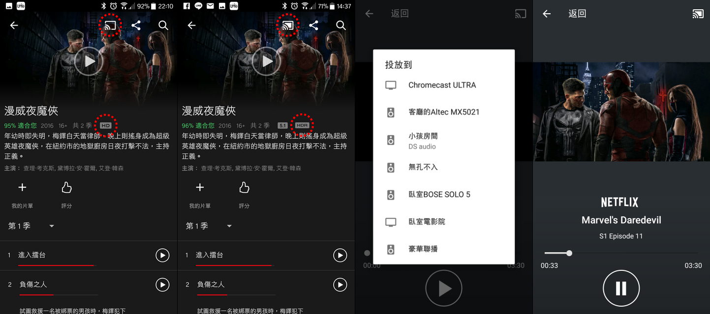 注意看我測試的漫威夜魔俠未投放前在手機上僅有HD圖示,連上投放設備後就出現了「5.1」與「HDR」選項,這樣表示播放這個影片就可以用上HDR技術了。