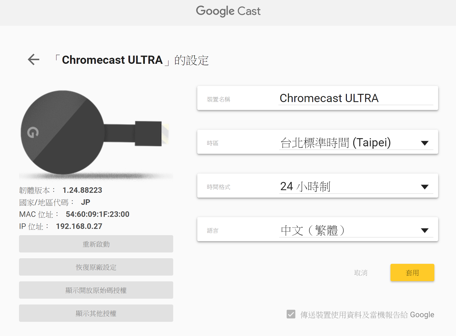 Chromecast Ultra,國家顯示「JP」,不過不影響使用。