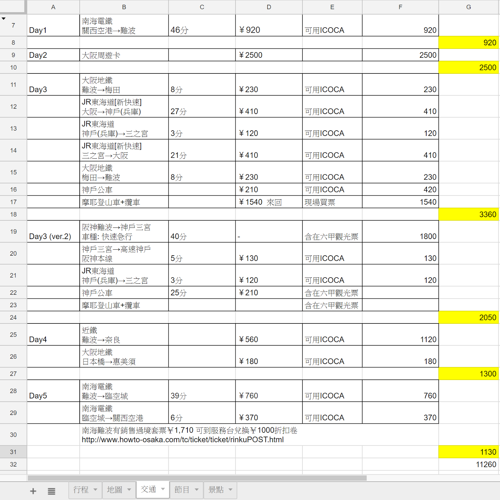 主要的3天行程因為分別前往「難波市區」、「神戸」、「奈良」,剛好有兩種票券「大阪周遊卡」、「六甲山觀光套票」可使用。