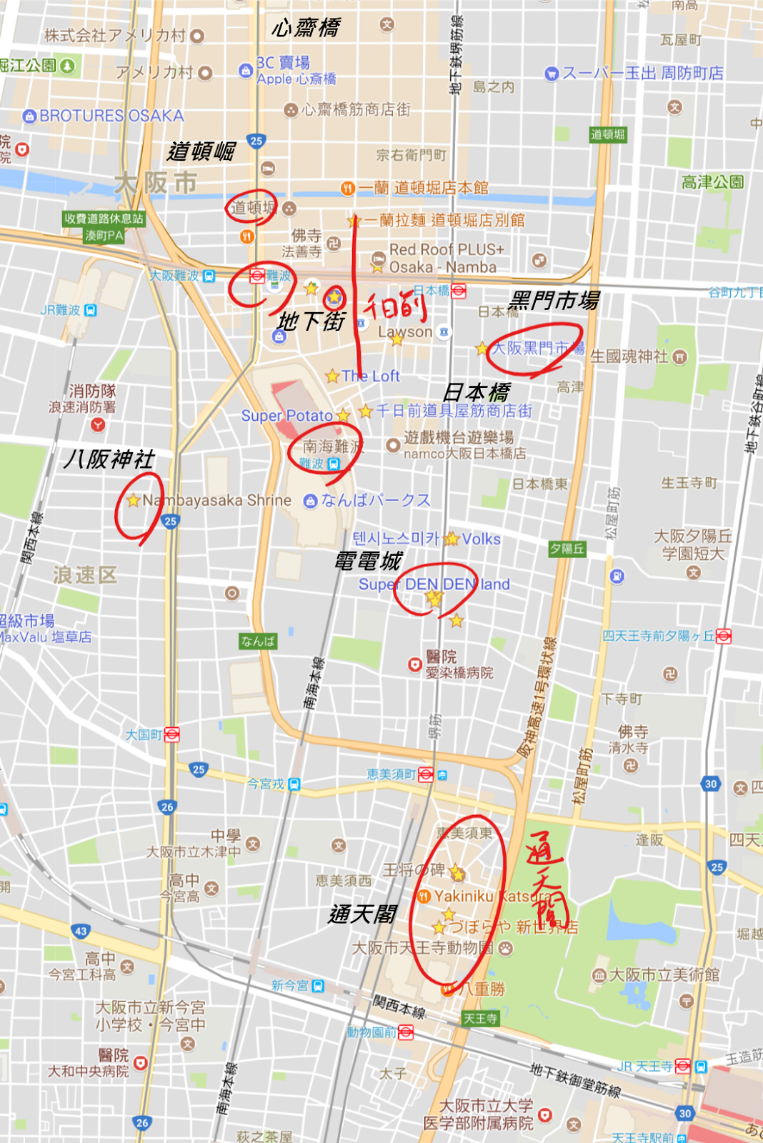 飯店在下圖Google Map中有標示出來,可以看到位置剛好是難波與日本橋兩個站之間。