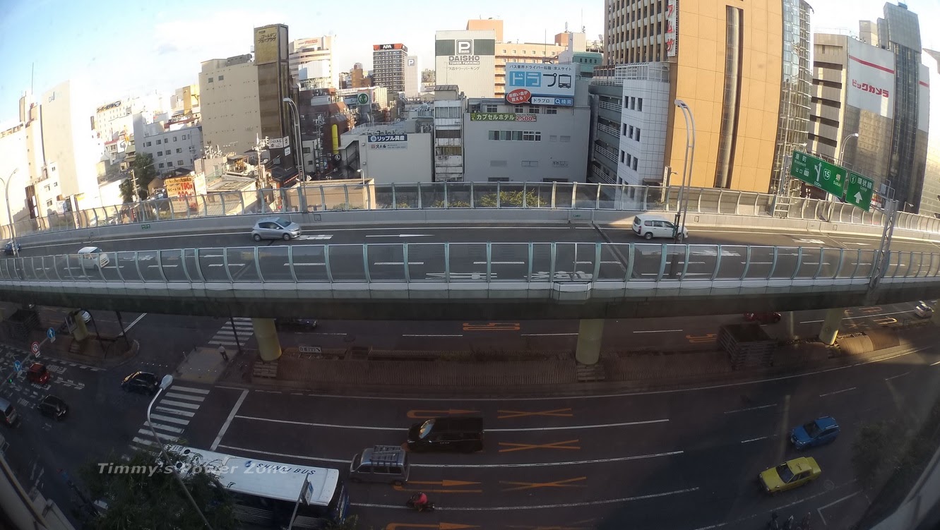 飯店外的街景,上方的高架是「阪神高速15號堺線」,前方走進去可達道具屋筋商店街。