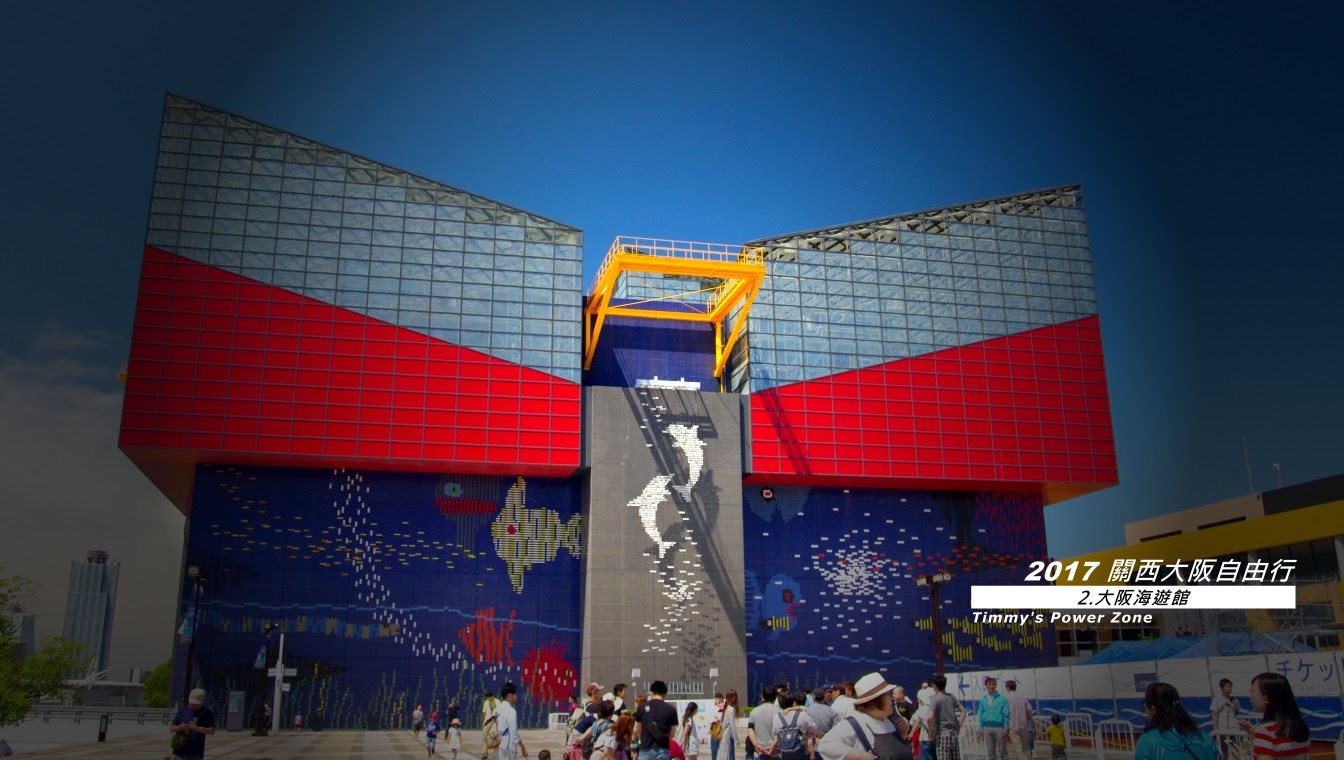 旁邊有紅藍白相間的大型建築很明顯的可以看出是海遊館