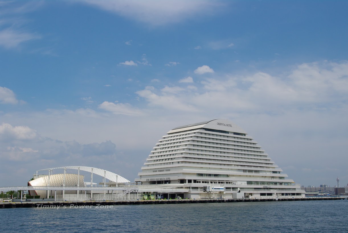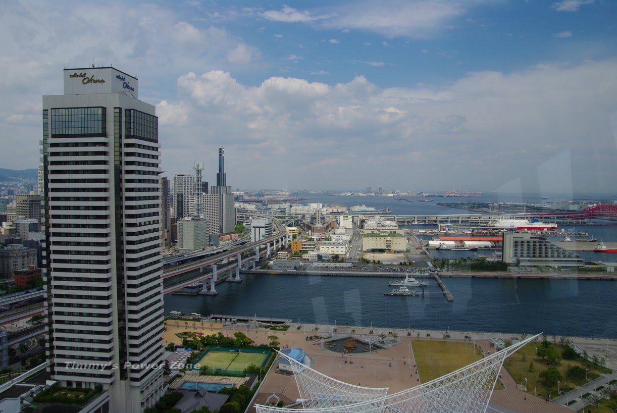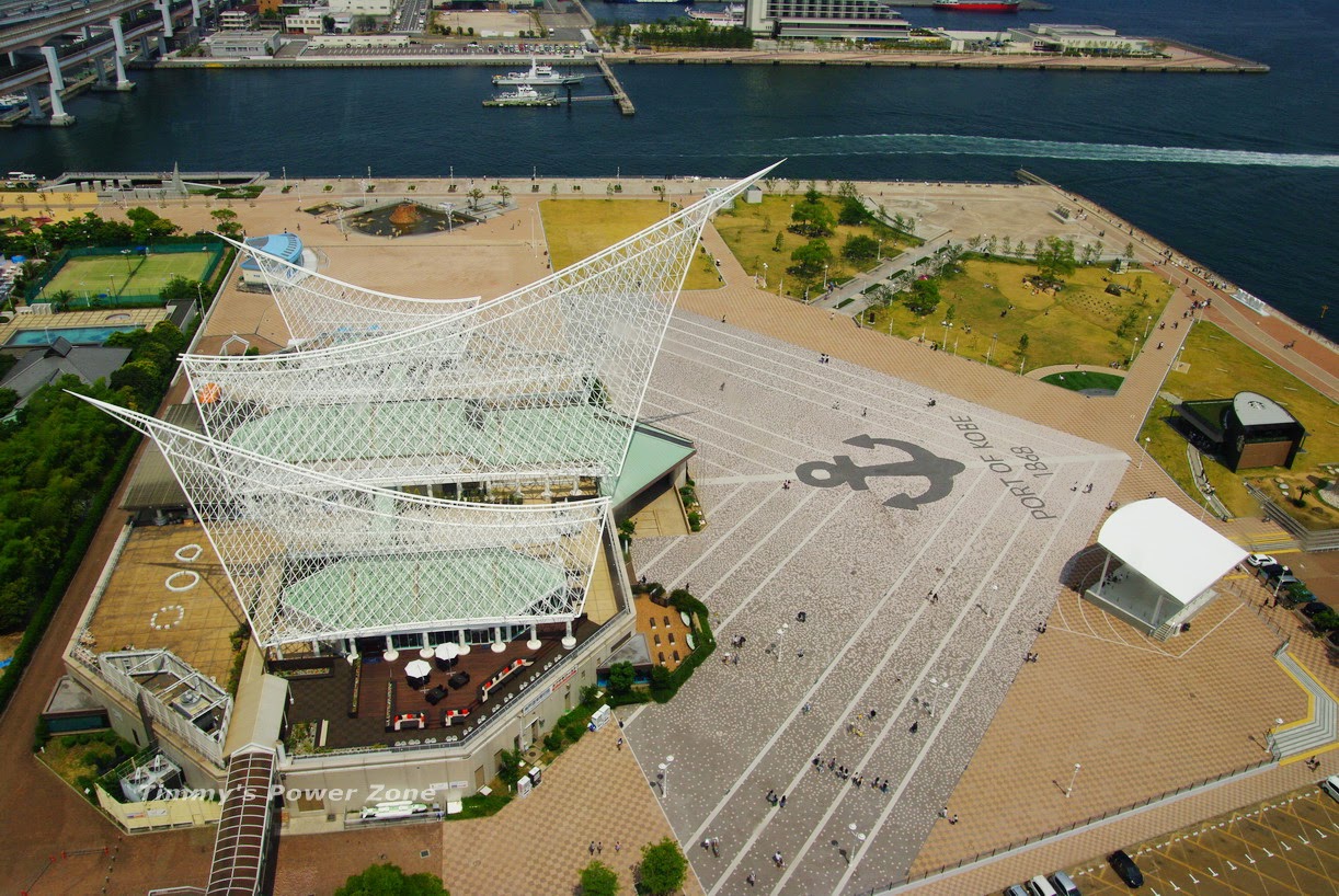 紅色鮮明的花瓶造型是「神戶港塔」,右邊四四方方的大樓是「Hotel Okura」,下方有幾何造型的網狀屋頂建築是「海洋博物館」、「Kawasaki World」