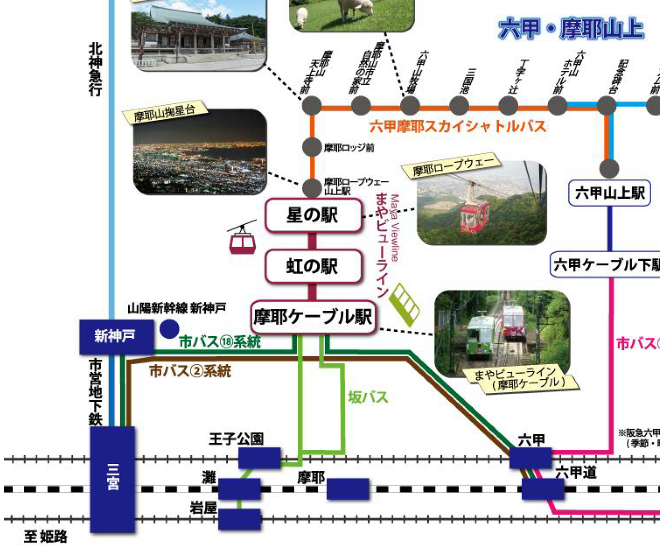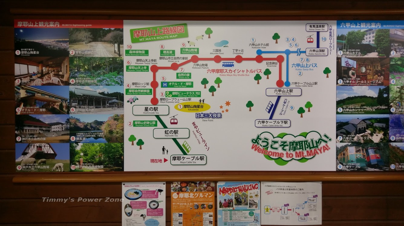 摩耶山上路線圖,其實我們只有要從左下角出發到「星之站」而已,其他如紅色路線則是山上巴士可以接駁到六甲山等觀光路線。
