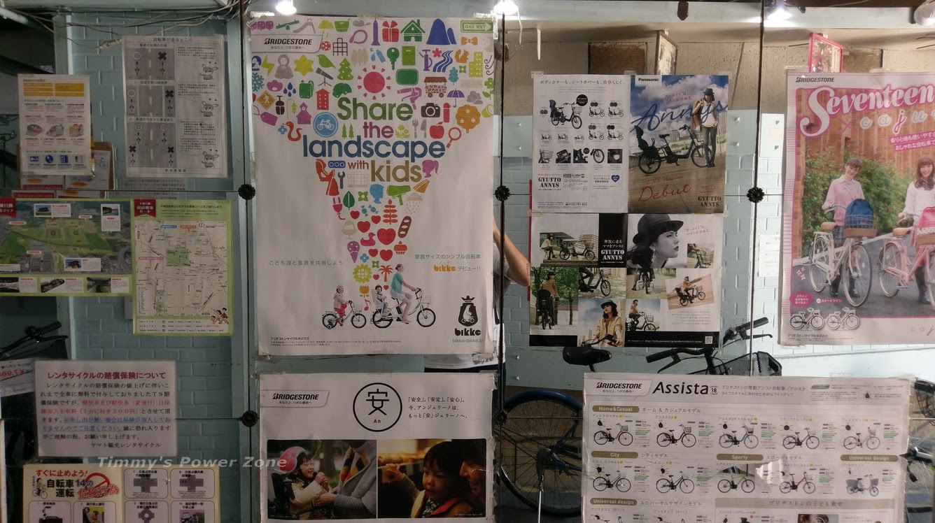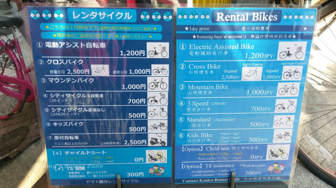 出租價目表,電動(輔助)自行車只要¥1,200。我們一直以為這種是跟台灣的電動自行車一樣。結果日本的電動(輔助)自行車真的就是輔助的,你還是必須自己踩,只是踩的力道不需要太大,也不會太費力,但是還是得透過雙腳踩踏板來驅動,蠻新鮮的。