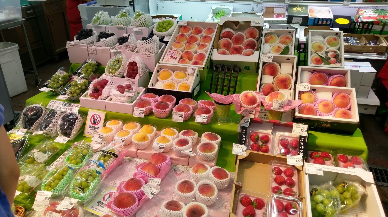 出現了¥400兩顆的,不過這個比較小,甜度不知道有沒有¥880的這麼優。我看到好幾個攤位都出現了「禁止碰觸」的符號,可能是觀光客都喜歡去摸?可是台灣人上市場買菜挑果菜都要先「觸診」阿,這點大家去逛的時候可能要特別留意一下,免得讓人討厭XD。