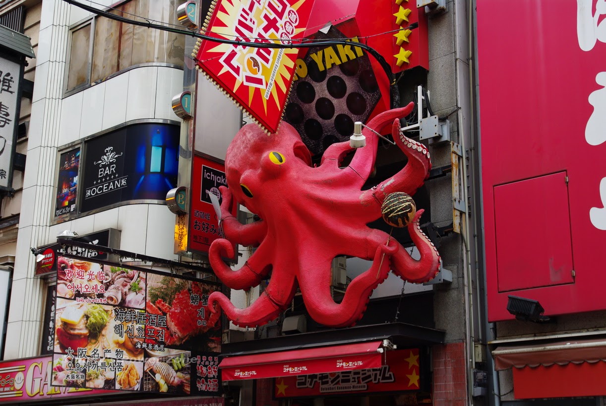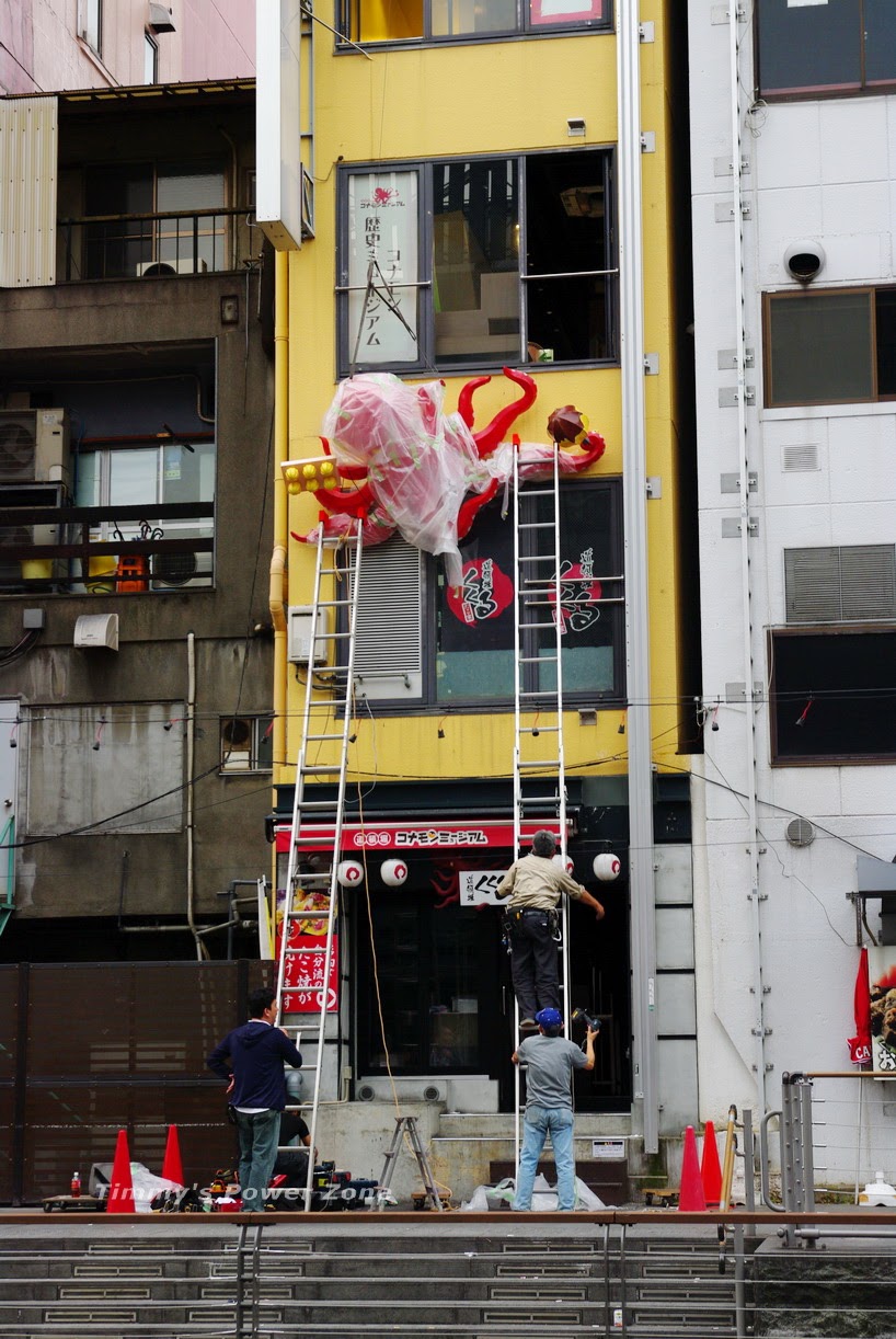 整個商圈到處都是酷炫的招牌,燈光雷射已經沒什麼了,還是立體的招牌比較有趣。路邊一早就在施工的章魚燒招牌