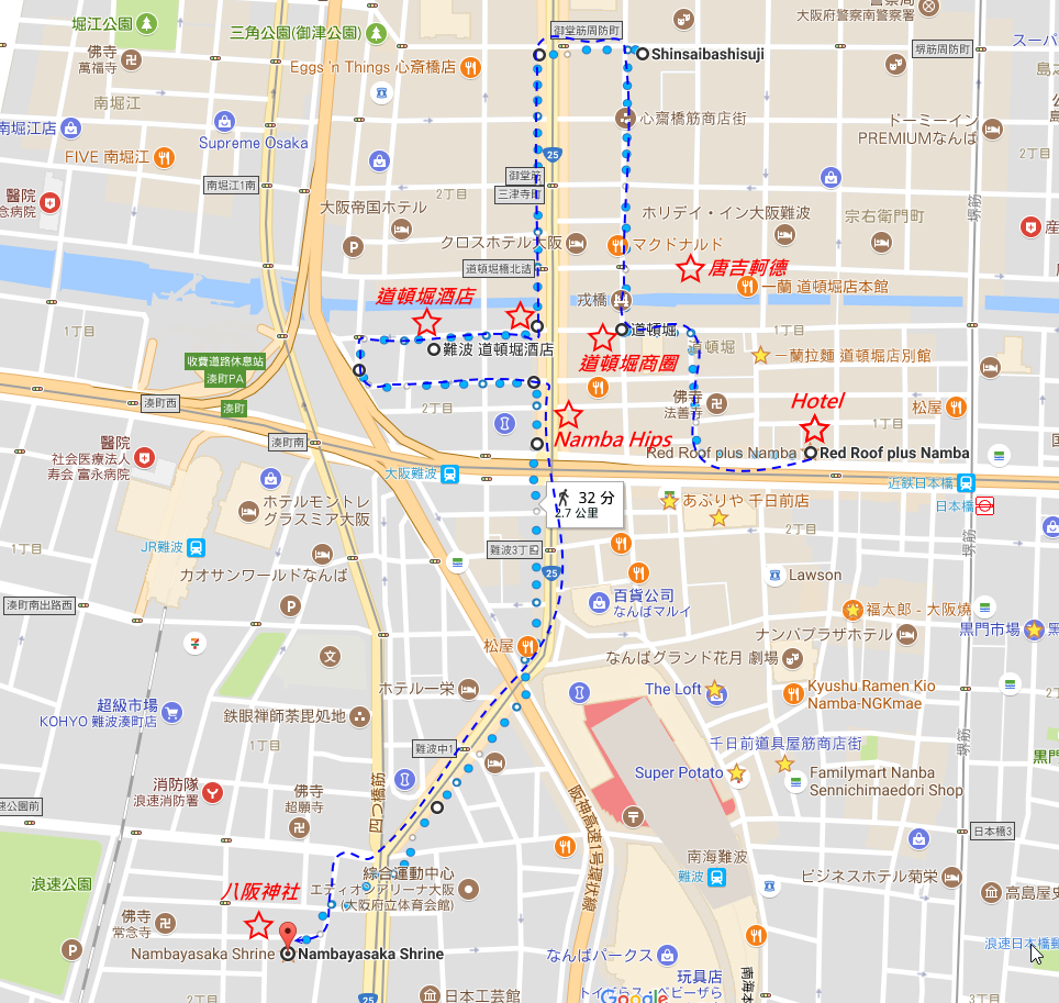 我的探險路線,沿著千日前商店街往北走,到達熱鬧的道頓堀商圈(凌晨也沒什麼熱鬧可言就是),再沿著心齋橋商店街北。折返路線回到道頓堀後,再繞進去向弄內逛個一圈,最後穿越車站外圍道路到達「八阪神社」