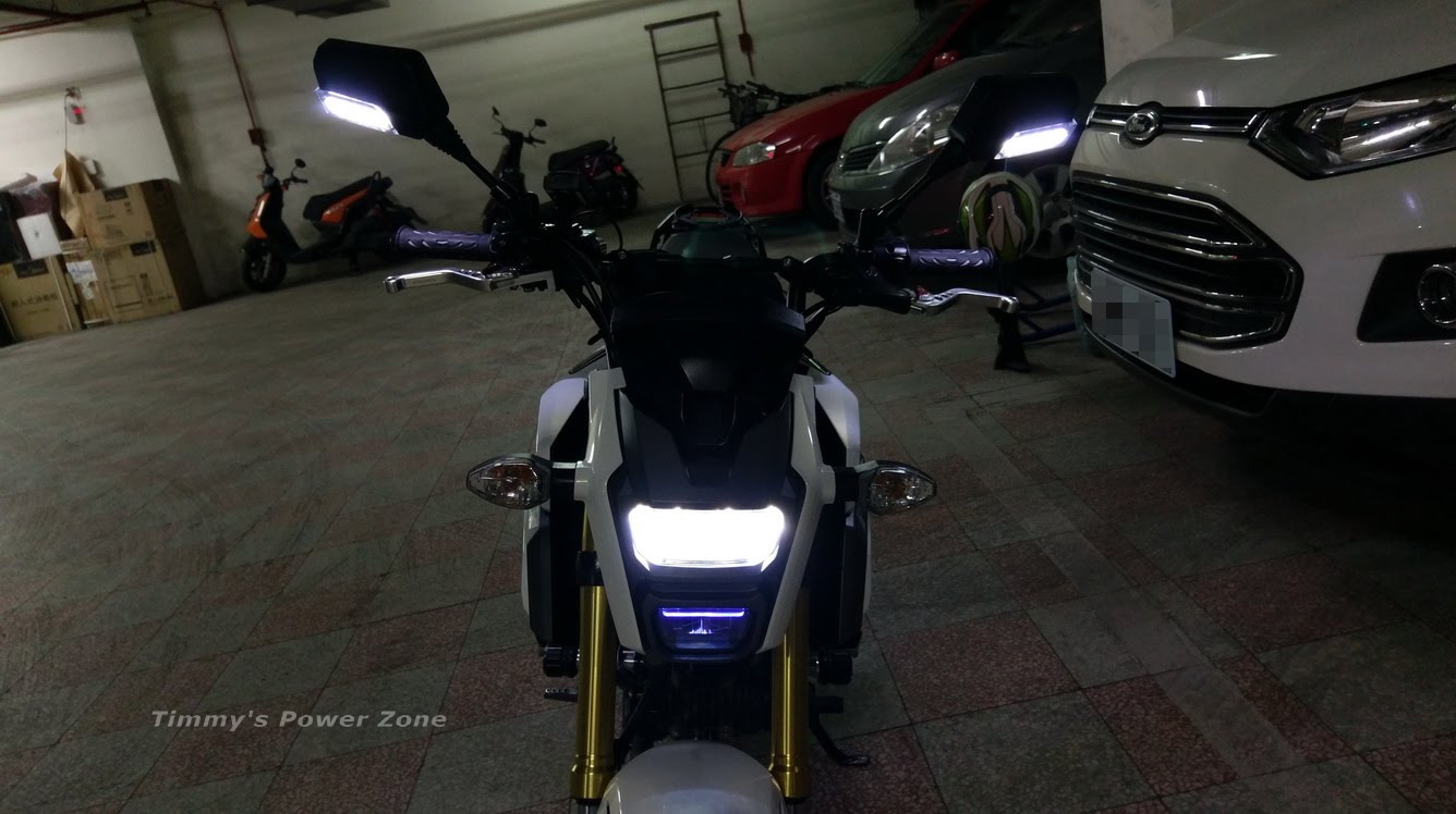 打開小燈的效果;小燈跟大燈的白光LED有相呼應效果喔!仔細看把手上有微微的燈光,這是前述提到照地燈的效果,晚上帶手套騎車的時候,手套好像有Spotlight一樣打在手套上,有種莫明的爽度XD