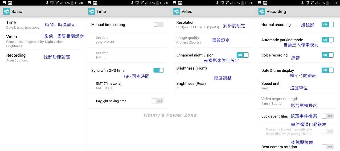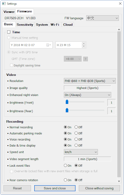 值得一提的是[Video]項目有[Enhanced night vision]夜視強化這個設定選項,可以讓你選擇是否要啟用夜視強化功能,這個選項我有測試一小段,後面有比較心得,可以參考一下。其他像是是否要啟用「自動進入停車模式」、「事件檔鎖定」...等這些特色功能都是在此設定。