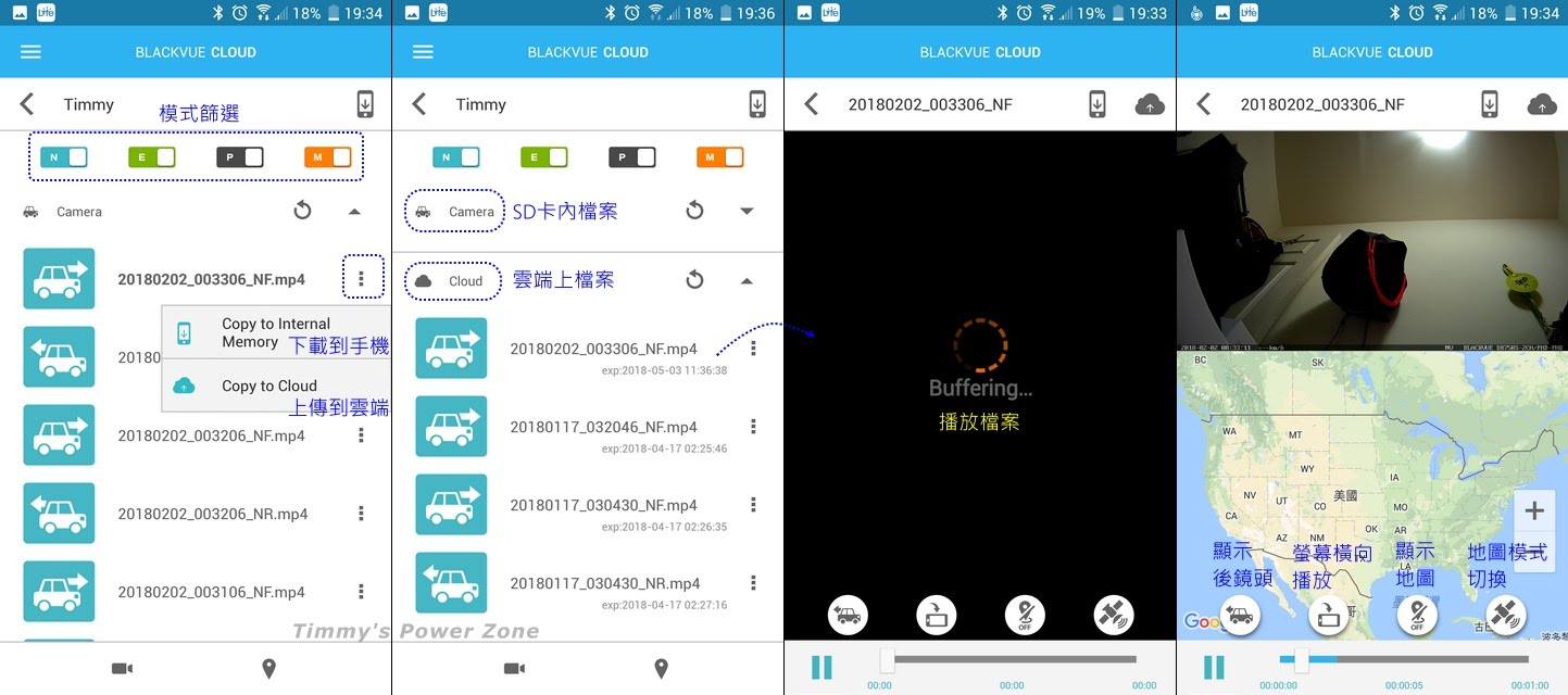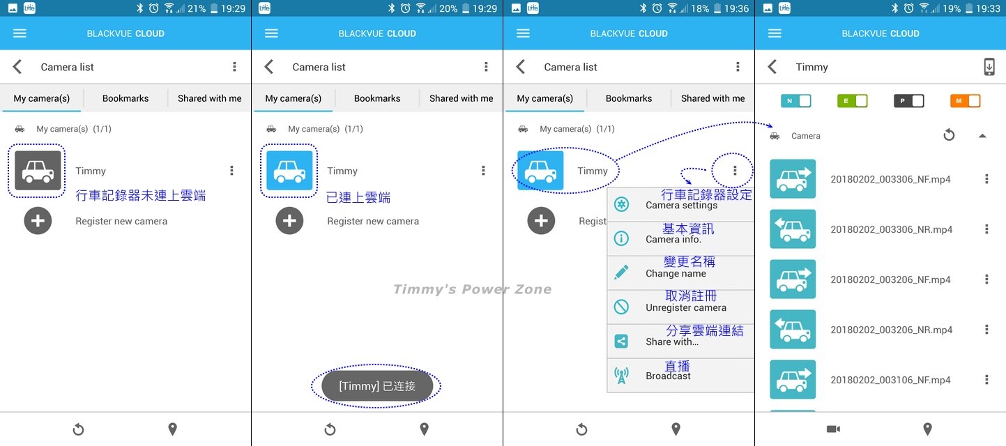 ↓雲端操作部份,主要是可以透過雲端的功能遠端瀏覽行車記錄器的影片,可以觀看「Live View」即時影像或是SD卡內已經錄製好的影片;同時可備份上雲端,或是複製到自己的手機內。