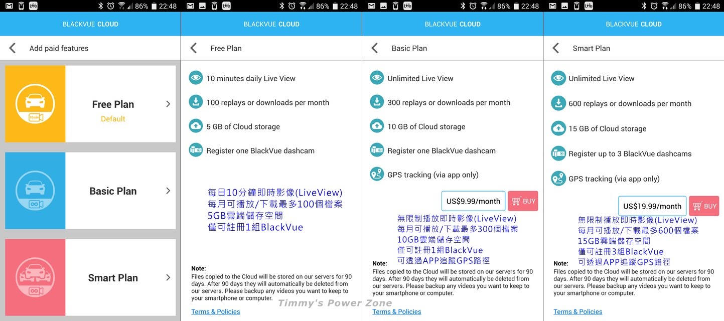 - Smart Plan:大部分與Basic Plan相似,有更多的檔案播放/下載數量與雲端儲存空間,此外一個帳戶可以註冊3個BlackVue行車記錄器。
