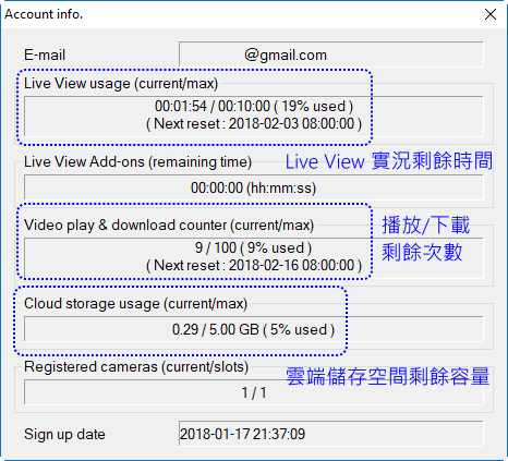 ↓在BlackVue的播放工具與APP中都可以查詢自己的帳戶資訊,了解方案中資源的目前使用狀況。