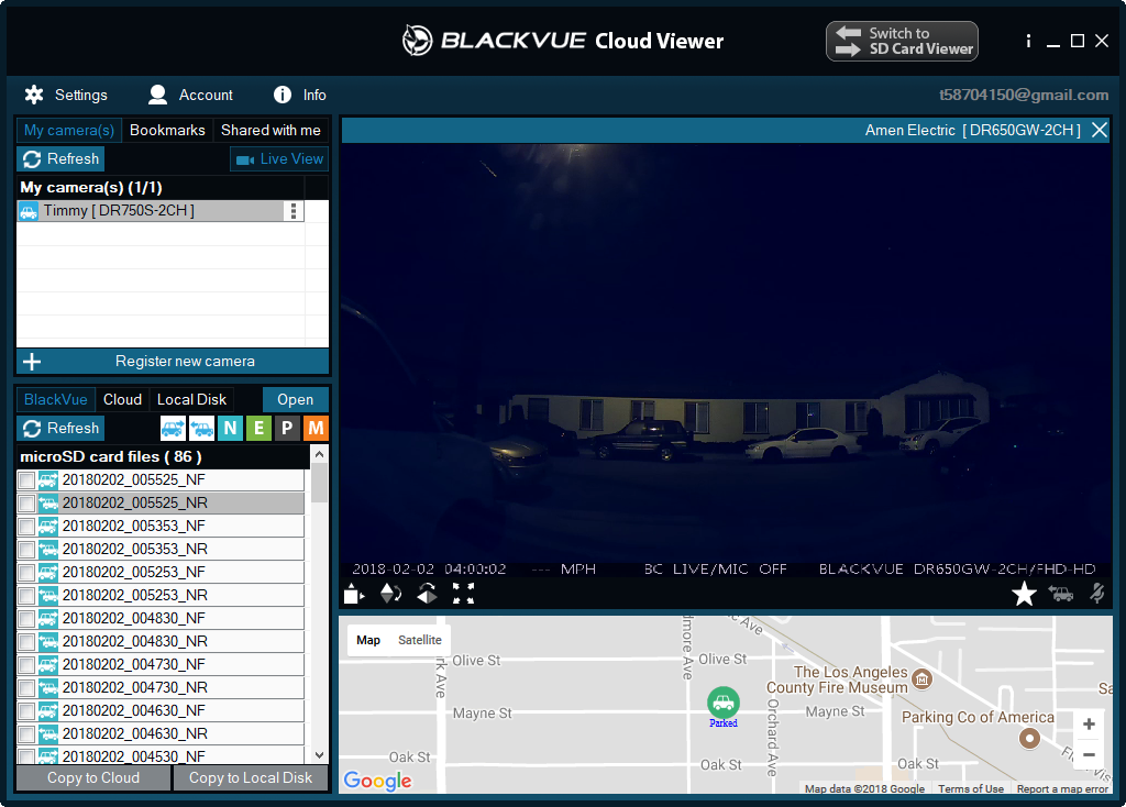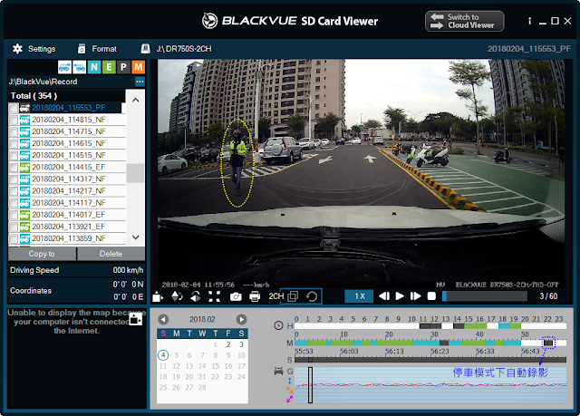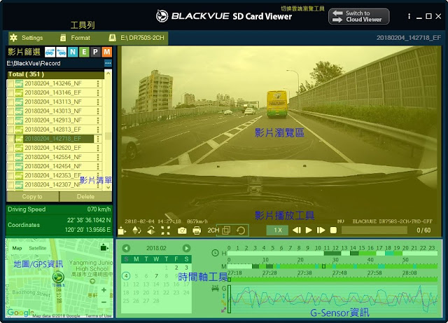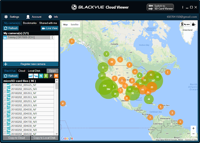 在電腦上使用雲端服務操作方式很簡單,先將Blackvue播放程式切換為「Cloud Viewer」模式,接著就會看到Google Map上有很多標示有數字的圓圈,數字是表示該區域有連到雲端的BlackVue。