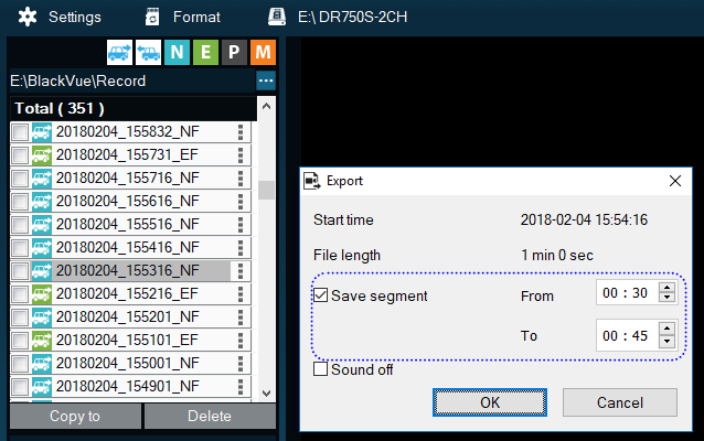 播放界面亦有相當多功能,如播放速度調整、截圖、影像翻轉、鏡像、複製、刪除、步進等。在播放清單可以篩選各種不同類型影片、切換前後鏡頭等。幾乎你可以想到的工具他都內建了。另外就是我最推的「匯出」功能,可以匯出當前的影片並且選擇要匯出的時間點、是否要消音,省去要加工剪輯的動作!