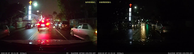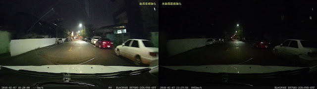 差異的部份截圖如下,可看到左圖開啟夜視強化後,整個亮度彷彿是有強力路燈一般,照亮整個環境,雖然雜訊多了不少,但是該清晰明亮的部份都有清楚呈現,尤其經過無路燈的昏暗路段(如第一組對照圖),整個差了十萬八千里,這個Starvis搭配BLACKVUE的調校後實在是太強大了!