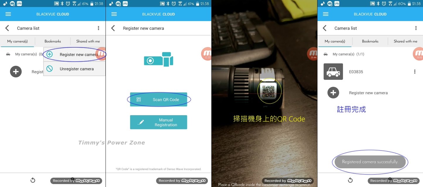使用方式很簡單,進到帳戶後,點選「Register new camera」,依照提示掃描機身的QR Code,BlackVue行車記錄器就會出現在帳戶上了。