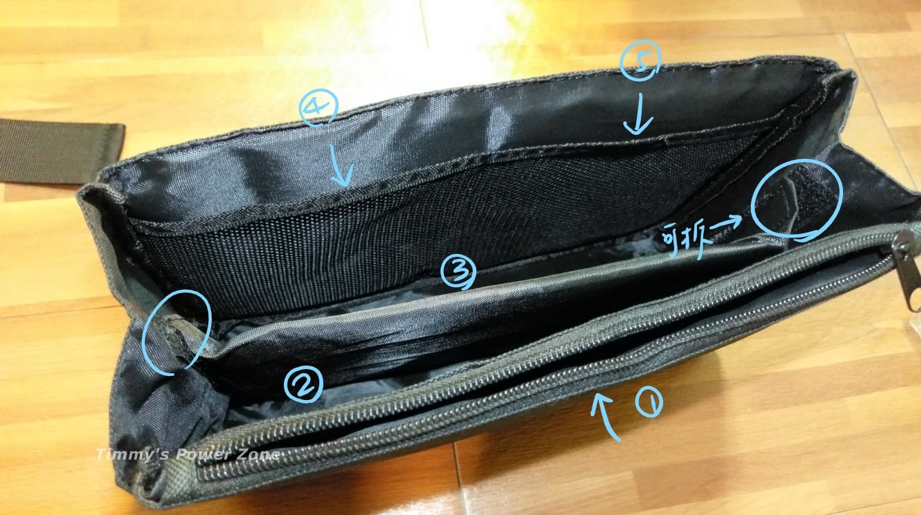 這個內袋的空間表現蠻不錯的,一共有5個夾層。1是有海綿墊的緩衝夾層,2跟3用一片活動夾層隔開,夾層是可以拆卸的。4跟5則是網袋可以用來收納手機跟一些線材,5.5吋的手機應也沒有問題。
