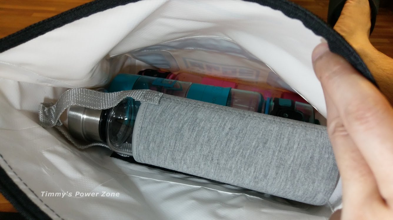 容量上測試一下,跟我的GIVI防水包相比來得大一些,基本一樣兩支太和工坊的500CC水壺可以置入沒問題,水壺高度大約23cm,放入水壺後兩邊還有餘裕空間。高度的話也有一些空間未滿,差不多剩下半支水壺高度。這個容量比GIVI表現好很多。