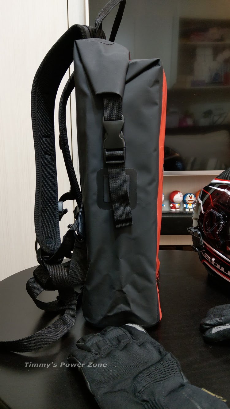 背包扣的方式跟以往看過的防水背包有些不同,雖然都是用捲的方式,但是它是往兩側各別固定,這點比較特別(可以參考我的開箱影片有固定方式)