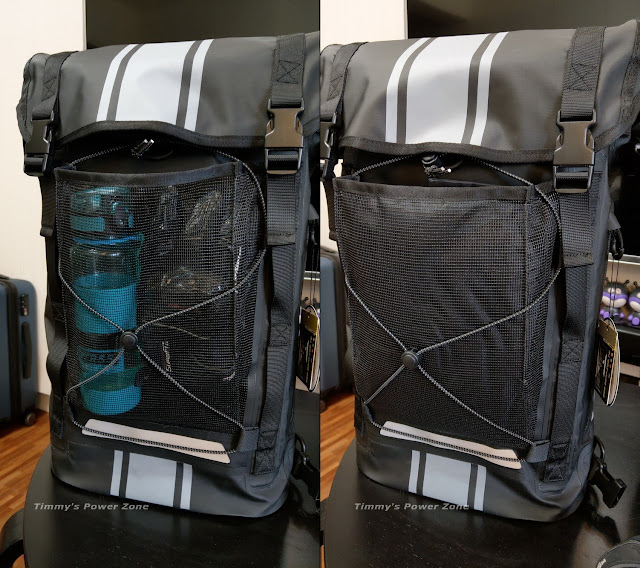 從正面就可以看到有彈力可調束繩與開放式置物網袋,下方有一道醒目的反光條