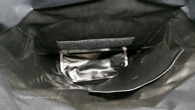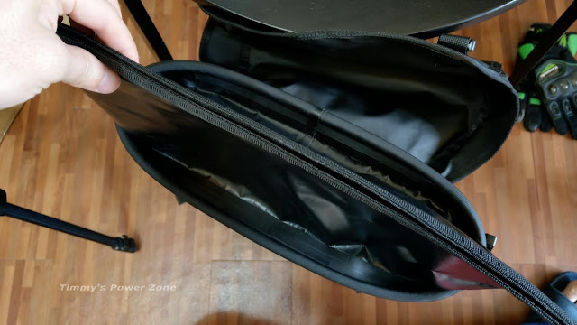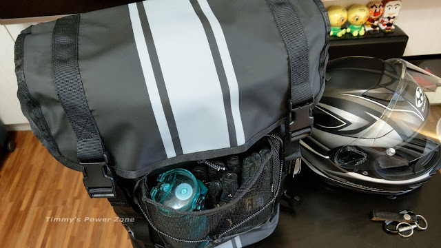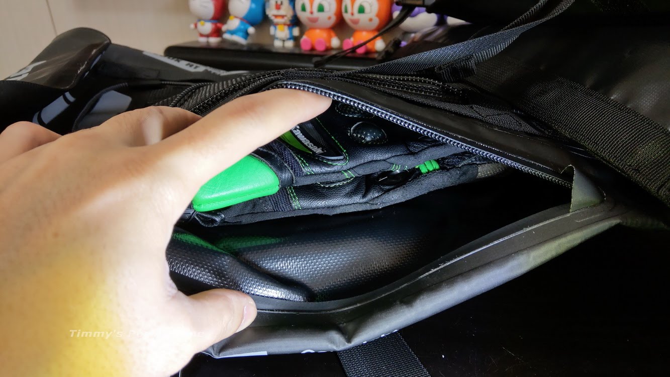 右側則有一個開口約17cm大的拉鍊夾層,這是我最喜歡的特色之一,大部分的防水背包都沒有這種便利的收納層,導致加個油、接個電話都得停車下來打開主袋取物,非常不便。多了這個就方便很多,而且空間頗大,還有輕度防潑水!