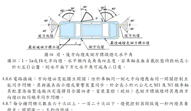 規範定義的範圍很廣,以方向燈為例,舉凡燈色、閃爍頻率、水平照射角度、垂直照射角度、位置、高度...等,這些都有明確的規範。所以在你下手購買那些來路不明的方向燈之前,先思考一下它這個商品到底有沒有經過檢驗囉。
