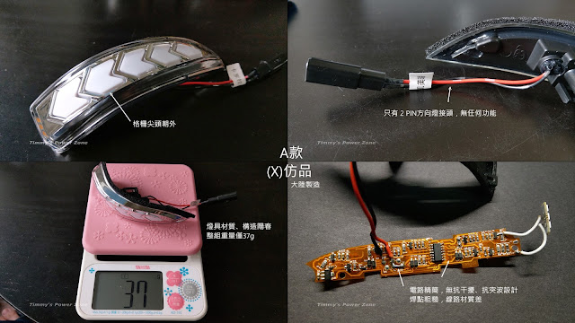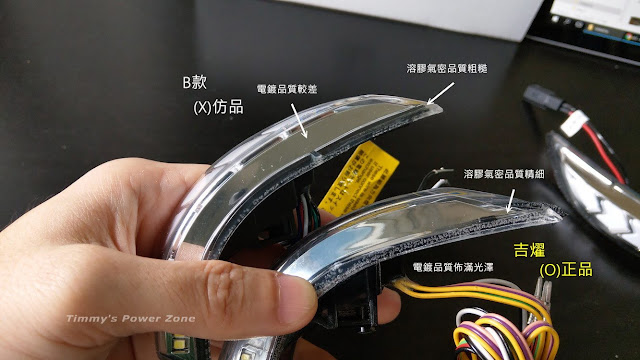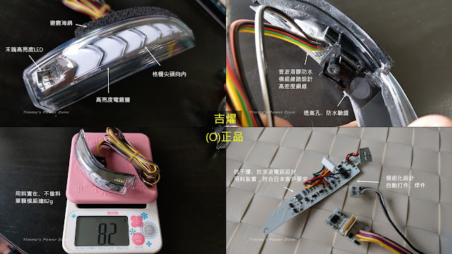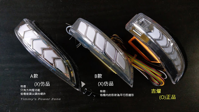 以下是適用於時下Toyota熱門車系(Camry/Altis/Yaris/Prius C/Aqua/CH-R)的後照鏡方向燈,3組由左到右分別標示為A仿品、B仿品,最後是吉燿的正品。