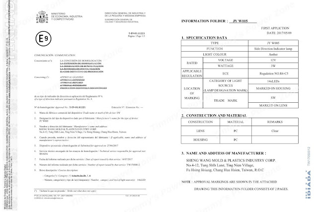 提醒一下,E-Mark不是只要取得一次證書即可,是「每個商品都要個別檢測、個別取得證書」喔!所以這不像一般簡易驗證,一個系列通過就全部通過那麼簡單。下圖為吉燿的產品「JY W005」這個型號通過ECE認證,每個型號通過檢測後就會取得一張類似這樣的證書。如此即可將E9這個號碼打在燈具上,並且旁邊會刻上核可編號。