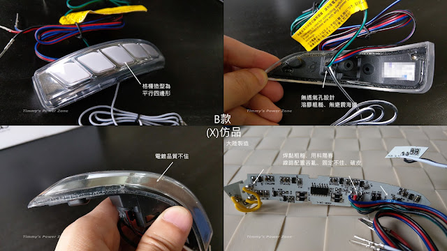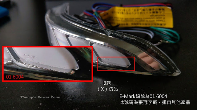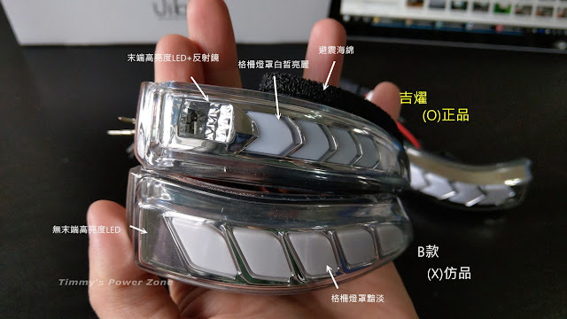 ↓仿品的LED等級比較差,所以末端的後車指示的這部份用了3顆LED,但都只是單一發光;吉燿正品的有設計多角度反射加上高亮度LED,發光效果遠勝仿品。