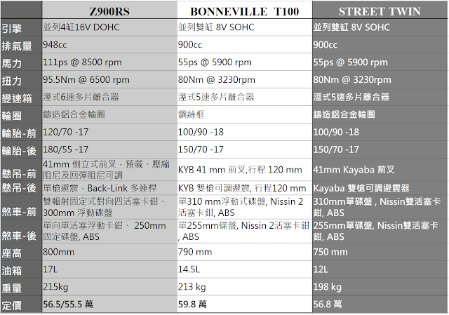 大概整理一下3款車(Z900RS/T100/Street Twin)的規格差異,