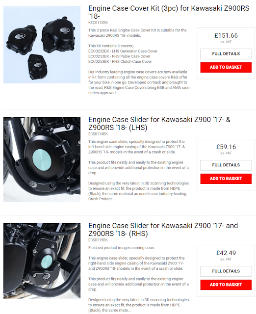 我大概搜尋了一下,目前台灣有販售比較好找的是R&G, GBRacing, Active...其中我比較喜歡GBRacing的外觀,但很可惜目前還沒有Z900RS的對應產品。Active則是兩件式的。最後我選擇R&G的產品。