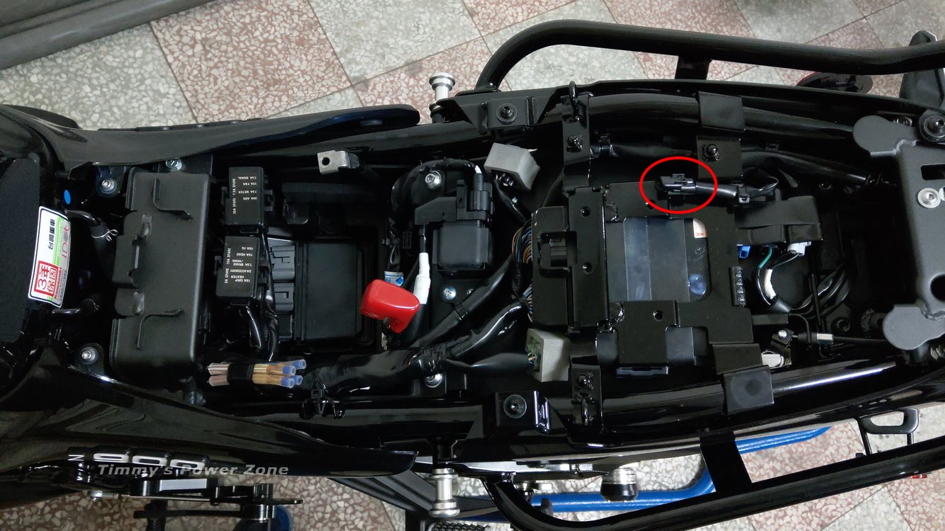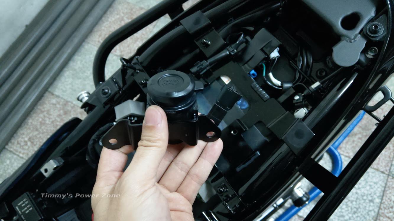 ↓USB充電器裝在這位置,不干涉椅墊(當然椅墊下的隨車工具要先拆下來)。如果後座要外接USB充手機也可行。