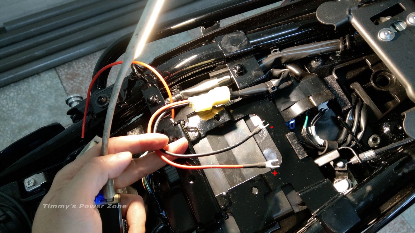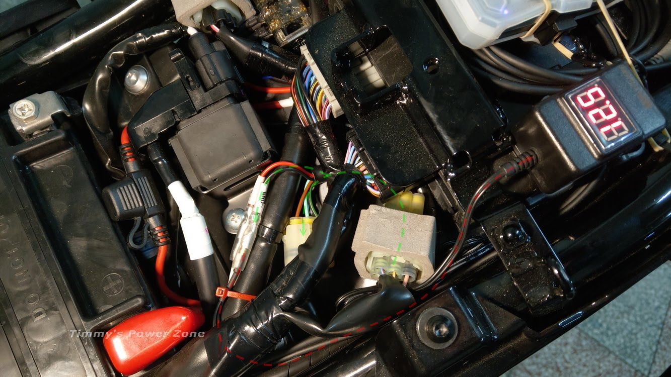 ↓利用僅存的縫隙把這組電源取出線塞進去,再將取出的電線連到我的USB充電線「威豹小子」。威豹小子除了有兩個USB輸出,還有電壓顯示,重點有獨立開關(需要用的時候再開即可),很適合放在座墊下使用。