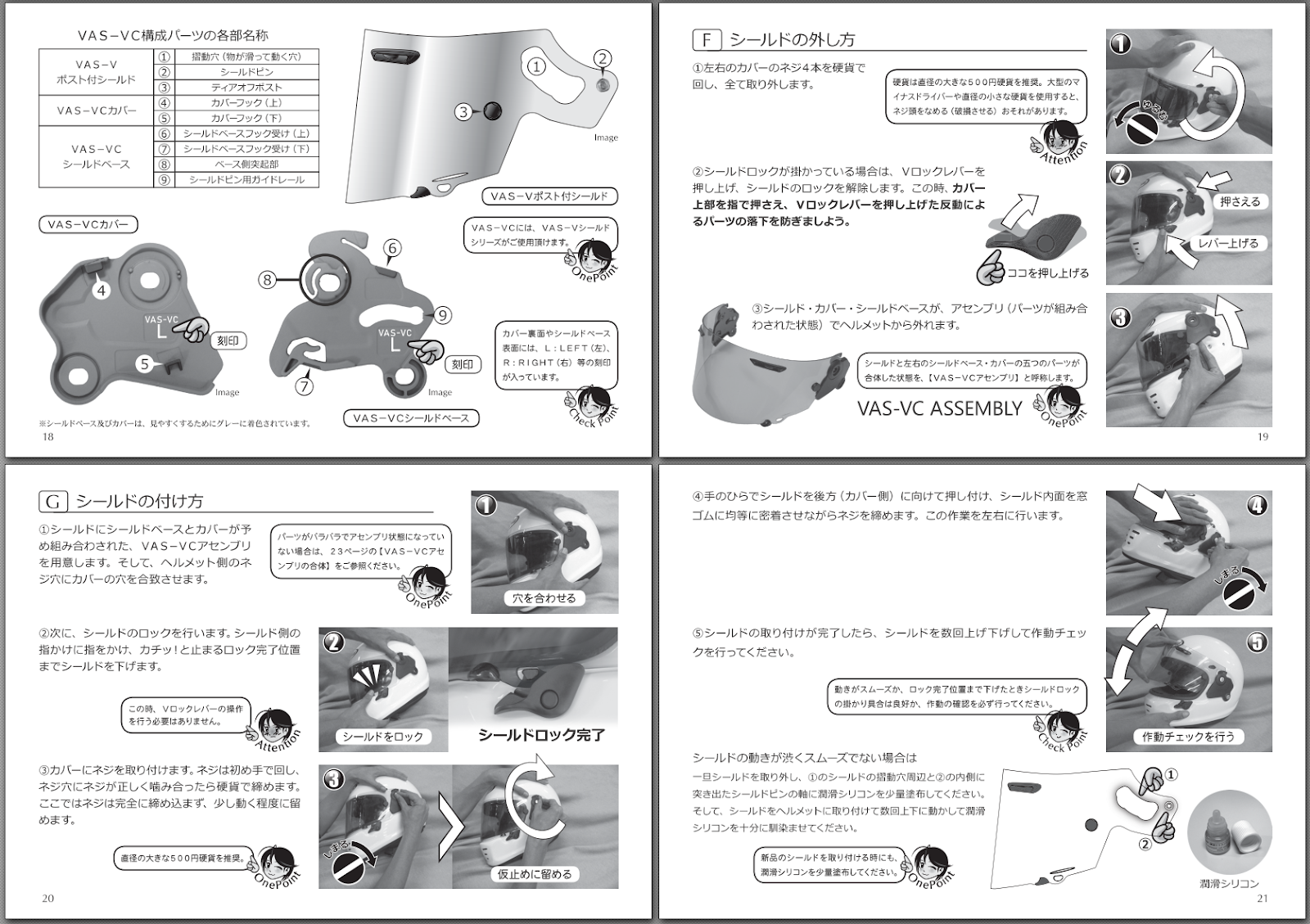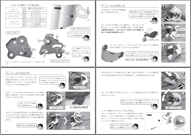 ↓Arai對我來說最大缺點就是鏡片不是快拆的,步驟比我戴過的SHOEI X11或是服役中的OGK RT-33都還要來得麻煩很多,下面擷取說明書上的鏡片安裝介紹。附上手冊連結,有興趣可以參考。
